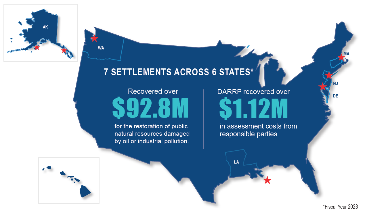 Oil spills and hazardous waste releases can close fisheries and beaches, kill wildlife, and adversely impact the coastal communities that rely on clean and productive waterways. In 2023, NOAA and partners achieved seven pollution settlements for $92.8M, were actively engaged in 58 restoration projects, and released 6 restoration plans authorizing over $3.73 billion for future restoration to address pollution impacts.